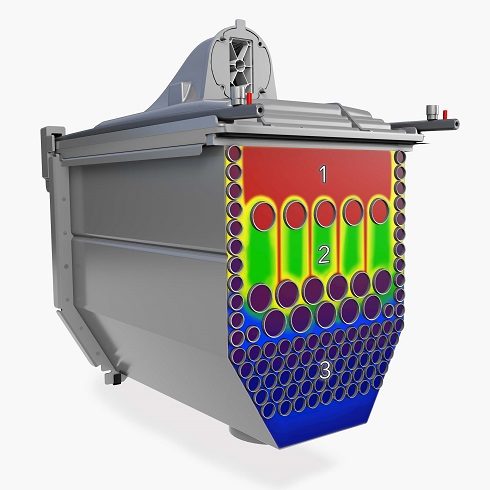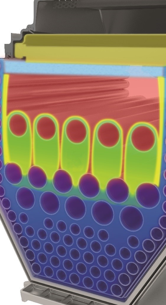 By managing specific zones with conflicting requirements, maximum energy yield can be achieved with extremely low emissions. In zone 1, the temperatures rise to over 1,000 °C, the formation of NOx is hardly possible here. Thanks to a fast flow and rapid temperature reduction, the flue gas temperatures are kept above 600 °C, which enables optimal CO formation. The condensation and the transfer of the remaining flue gas energy take place at approx. 56 °C in zone 3.